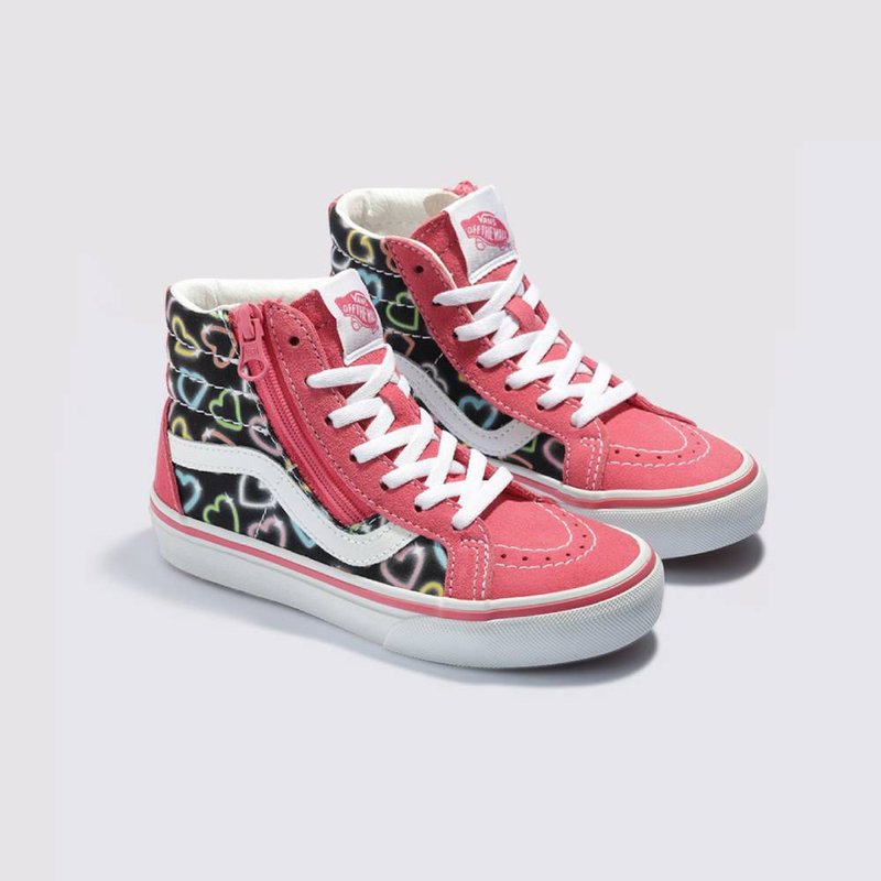 - Design Icônico e Divertido: O Tênis Infantil Sk8-Hi Tie Dye Hearts Pink Multi combina o clássico design high top da Vans com uma estampa divertida de coração neon e camurça rosa, proporcionando um visual único.